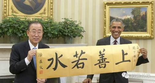 今年是联合国成立70周年,同样是韩国人的现任联合国秘书长潘基文先生,作为通晓东方文化的世界级领袖人物,他热爱自己的国家――韩国,同样也热爱世界与和平。前不久在美国,为美国总统奥巴马赠送生日礼物的时候,亲笔手书了四个汉字――“上善若水”,作为一件珍贵的礼物,意味深长!