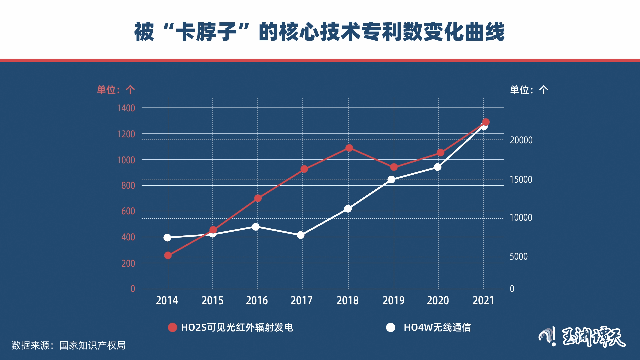 国内最先提到“卡脖子”的,是一家通信企业。这是中国通信行业遭受美国打压后,专利数的变化曲线: